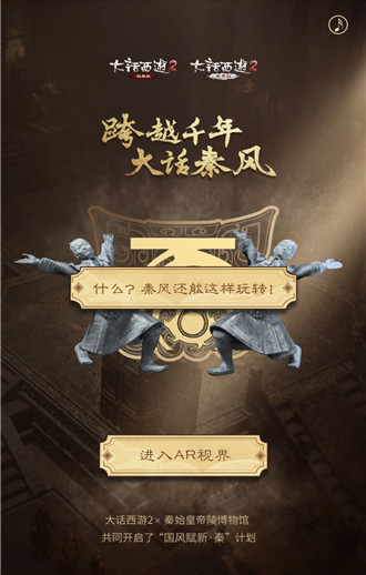 AR小程序,大话西游2✖秦始皇帝陵博物院,开启秦陵幽宫副本,扫码AR纪念章,欣赏火遍全网的大秦老铁花式出招,最后跳转到宣传界面,引导用户注册下载。