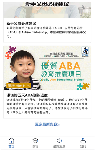 课程学习小程序,主要为自闭症和ABA学习平台,为家长老师提供海量教学视频资源库,帮助孩子达到最理想的训练效果。