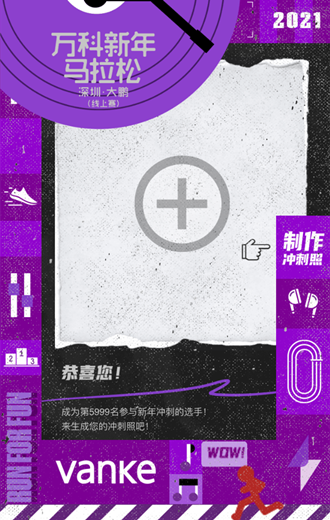 上传照片+DIY+录音+生成海报H5万科新年推出的马拉松(线上赛),新年冲刺照H5,用户通过上传照片到新年冲刺照,添加专属贴纸,生成精美海报留念,还可以分享给好友,点击收到他人新年祝福,也可以自己录制祝福语,为下一位参赛的选手送出新年祝福。