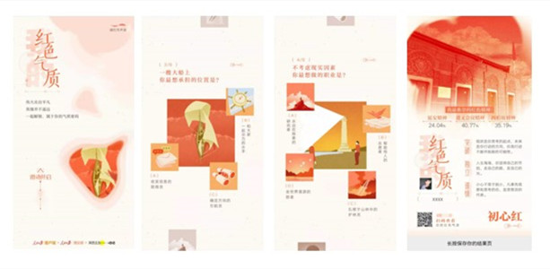 案例描述:测试H5,以“我的红色气质”为主题,一共有6小道测试题,点击“滑动开启”交互,进入答题测试,每个场景配合轻松的文字表述和音乐,答题结束后输入用户昵称,海报呈现测试结果和性格分析,弘扬红色精神。