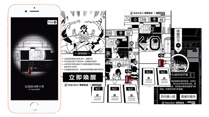 亮点:以游戏形式展现,以最快的速度点击笔记本唤醒同学,如果GAME OVER了,可以点击雀巢咖啡红被,延长时间并唤醒同学。雀巢咖啡红杯代表雀巢咖啡,生动形象,使用户即玩了游戏,有潜意识里了解了到产品。